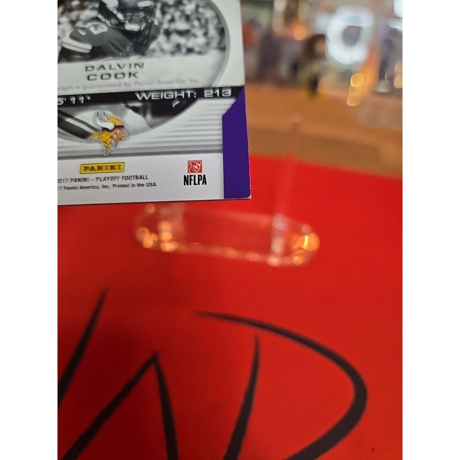 The 2017 Panini Playoff Rps Autographs Dalvin Cook #RPS-DC /199 trading card is a valuable collectible item for football fans. Featuring the talented player from the Minnesota Vikings, this autographed card is part of a limited print run with only 199 copies available. As a rookie card with serial numbering and insert features, it holds special significance for collectors looking to add a high-quality piece to their collection. The card showcases the athlete's signature and is a sought-after item for sports trading card enthusiasts.