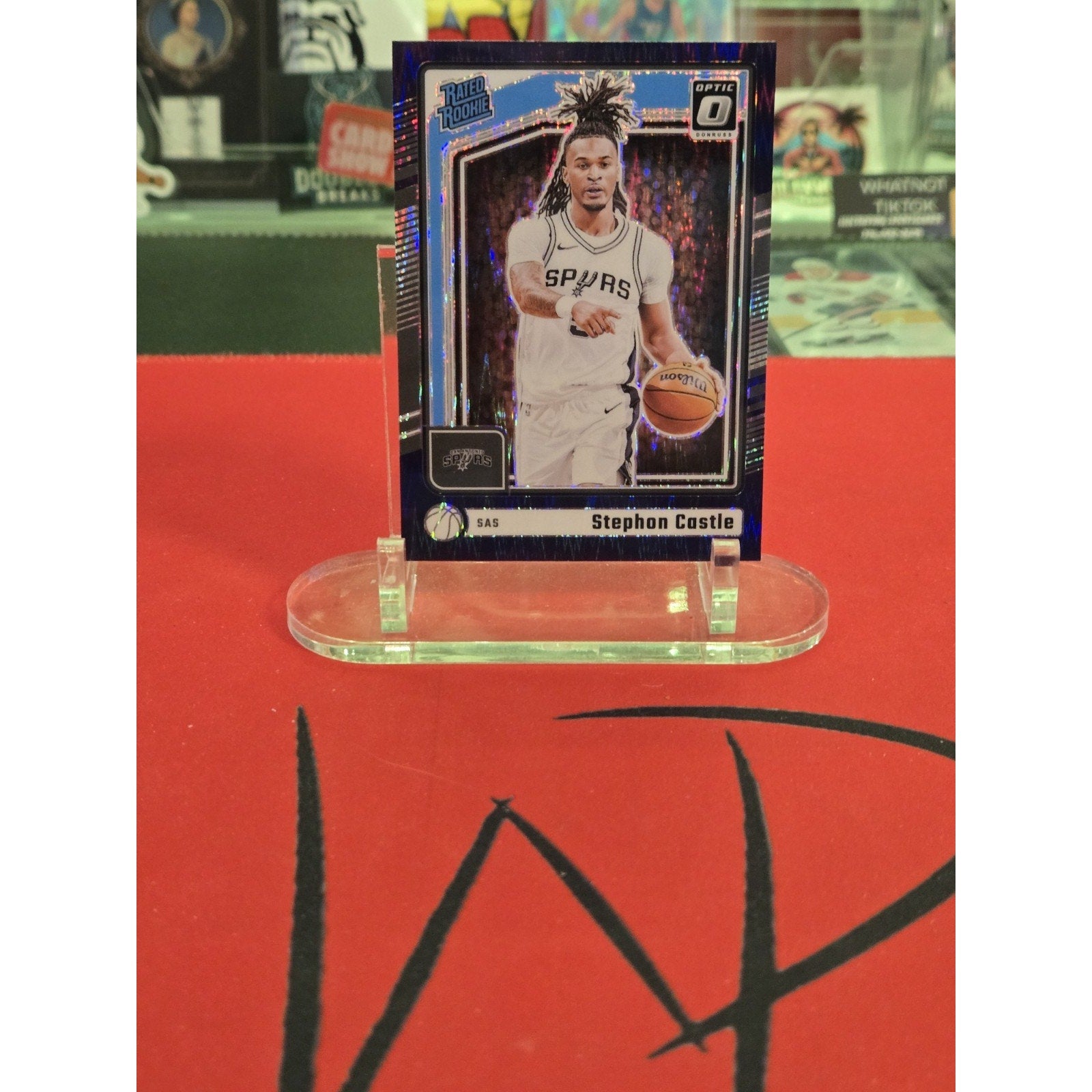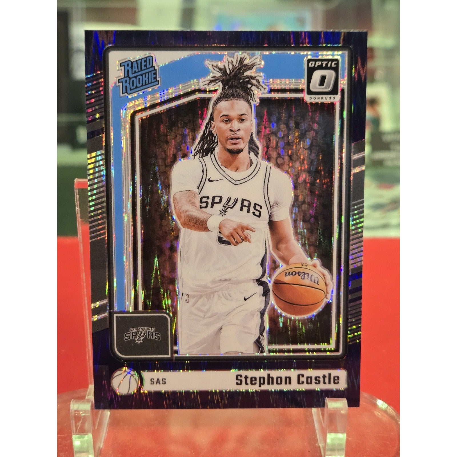 The product is a 2024-25 Panini Donruss Optic Rated Rookie trading card featuring Stephon Castle of the San Antonio Spurs. This particular card is a Purple Shock Prizm parallel variety, adding a unique design element to the collectible. As a rookie card, it holds special significance for fans and collectors looking to add a piece of the player's early career to their collection. The card number is 254, making it a sought-after item for enthusiasts of basketball trading cards.