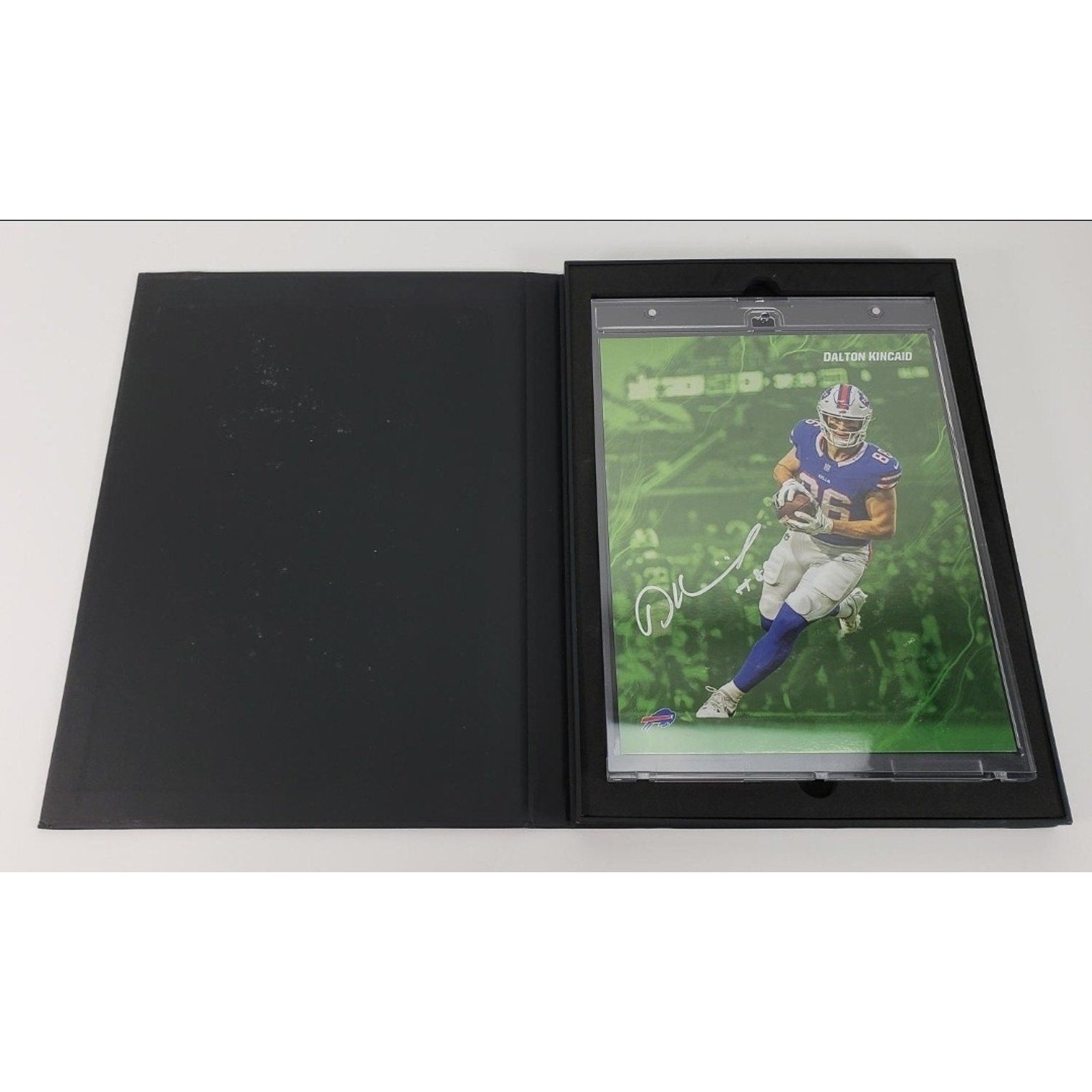 The product is an 8x10 oversized trading card featuring an autograph from Dalton Kincaid of the Buffalo Bills. This card, part of the 2024 Fanatics Emanate series, is limited to a print run of 99 and is authenticated by Fanatics Authentic. The card is a unique green parallel variety, making it a special addition to any football card collection. Made in the United States, this original sports trading card is a must-have for fans of the National Football League looking to add a rare and valuable piece to their memorabilia.