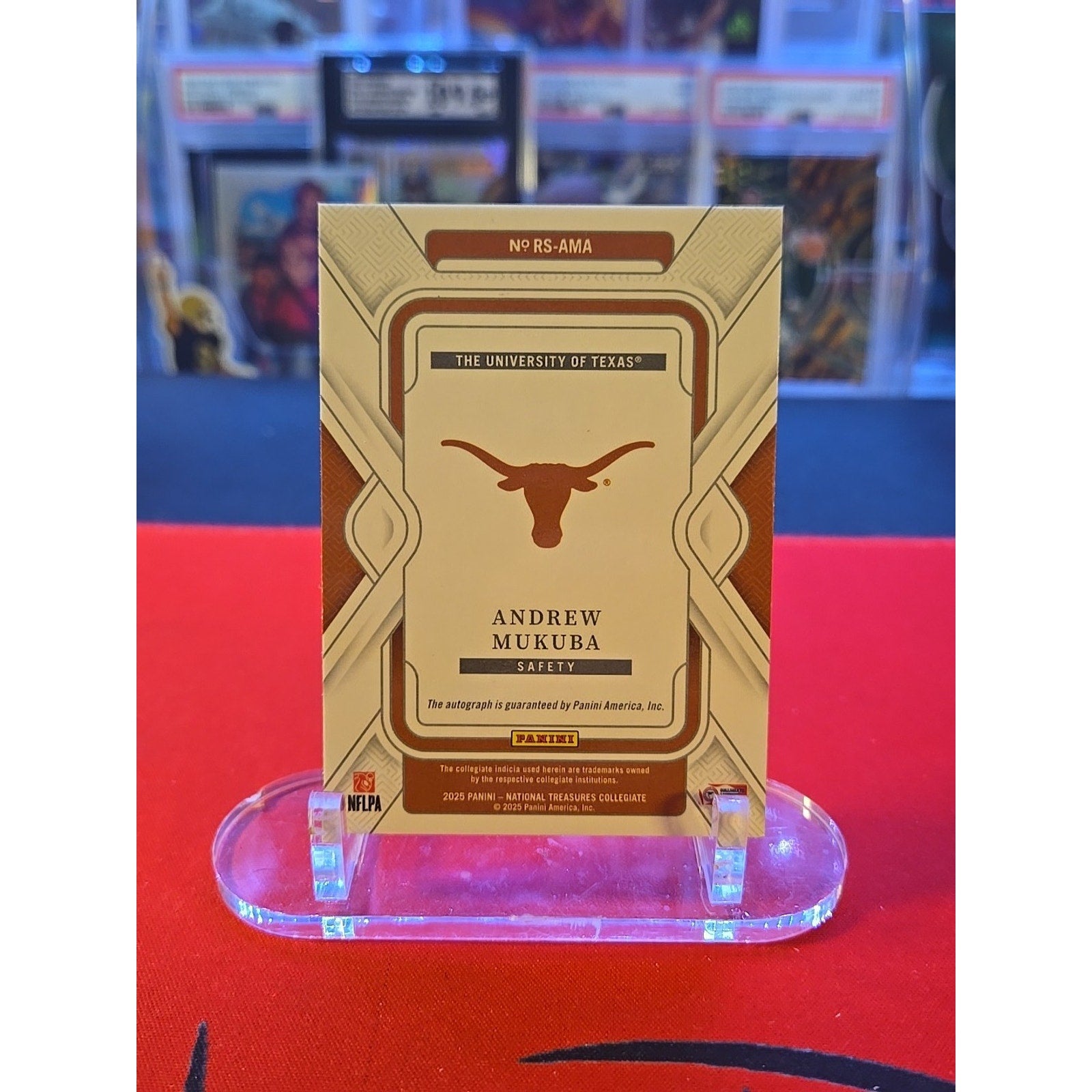 The 2025 Panini National Treasures Collegiate Andrew Mukuba trading card is a highly collectible item featuring an autograph from the football player. This rookie card, numbered out of 49, showcases Andrew Mukuba from the Texas Longhorns in the National Collegiate Athletic Association (NCAA) league. Manufactured by Panini, this sports trading card is a valuable addition to any collector's set, especially for fans of the Texas Longhorns and football enthusiasts alike.