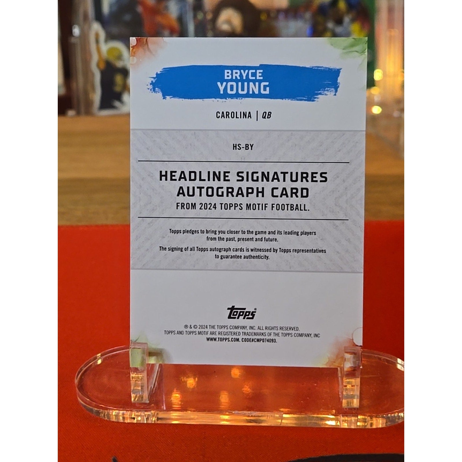 The product is a trading card featuring an autograph of NFL player Bryce Young from the 2023 Topps Motif set. This specific card is part of the Headline Signatures insert set, with a print run of only 49 copies. It is a highly sought-after collectible item for football fans and card collectors, showcasing a unique design and special features such as being serial numbered and part of a parallel/variety series. This card is a valuable addition to any sports trading card collection, especially for fans of the Carolina Panthers and rookie players like Young.