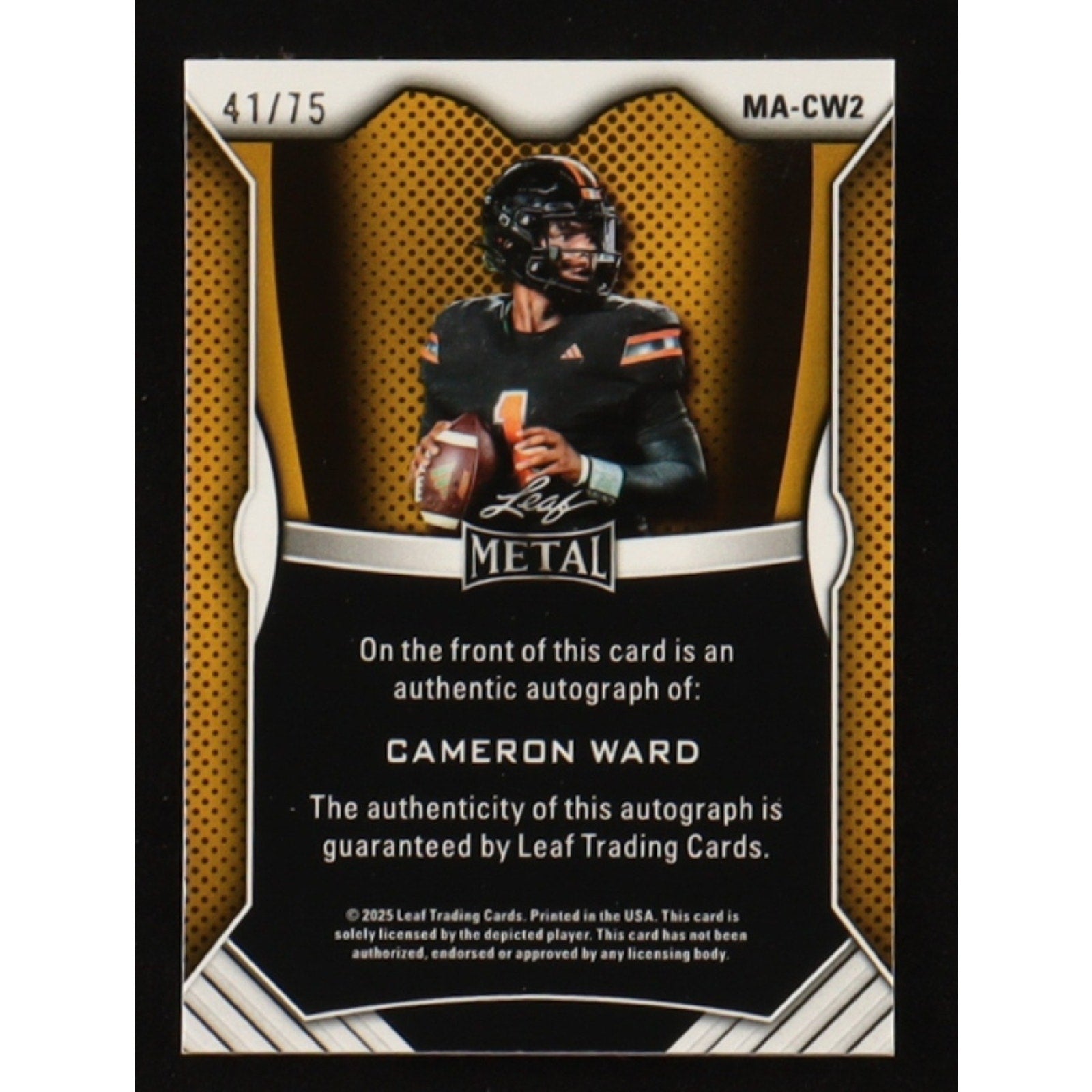 The product is a 2025 Leaf Metal Prizmatic White rookie trading card featuring Cam Ward of the Tennessee Titans in the National Football League. This autographed card is limited to a print run of 75 and comes with authentication from Leaf. The card is part of the Prizmatic White insert set and is a collectors' edition, making it a sought-after item for fans and collectors of football trading cards. Made of card stock, this original sports trading card showcases the young athlete's signature on a label or sticker.