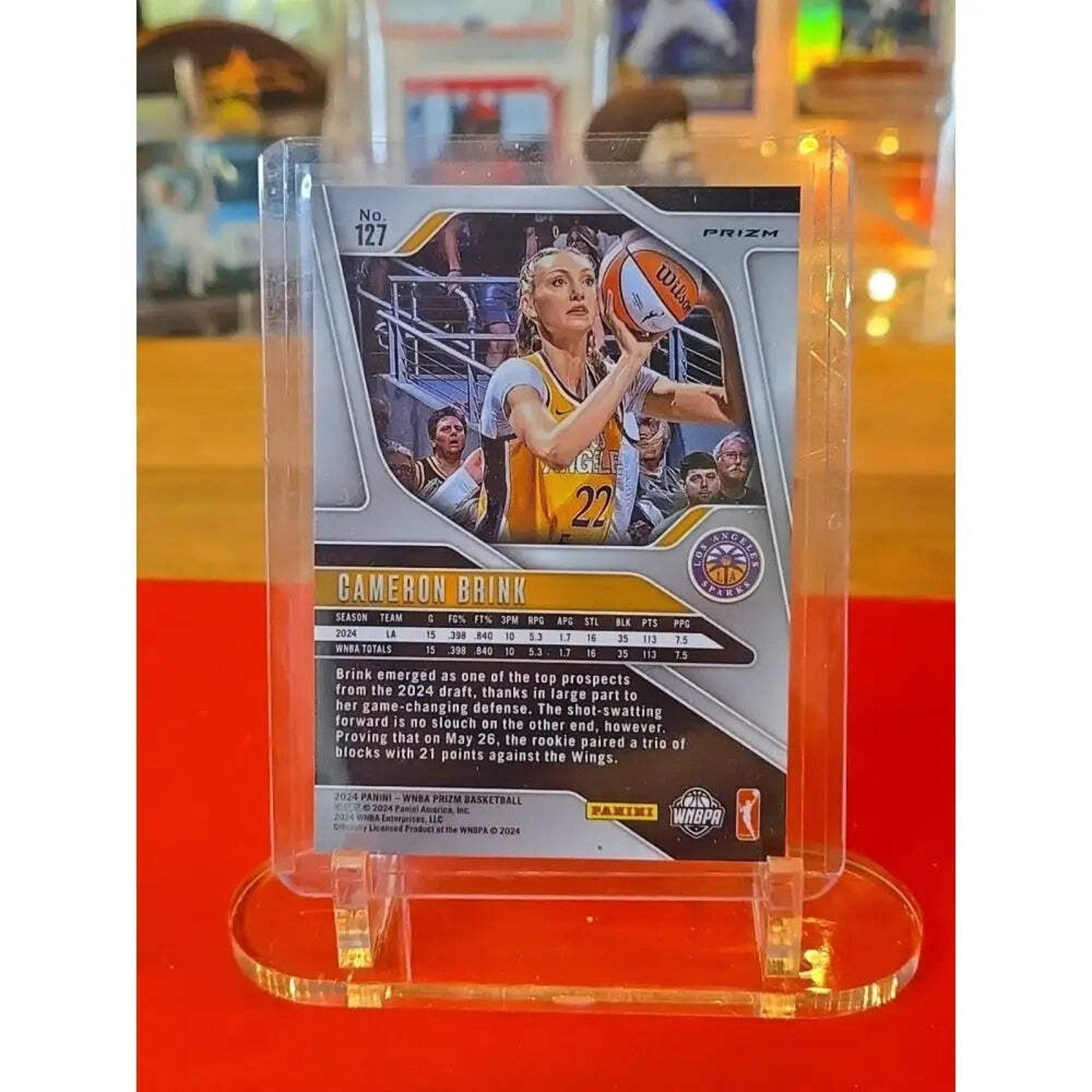 The product is a 2024 Panini Prizm WNBA trading card featuring Cameron Brink #127 from the Los Angeles Sparks. This particular card is an Orange Ice Prizm rookie card from the base set. As a sports trading card, it collectible item is sought after by basketball fans and card enthusiasts for its rarity and unique design. With its association with the WNBA and a promising rookie player like Brink, this card holds value for fans of the sport and collectors alike.