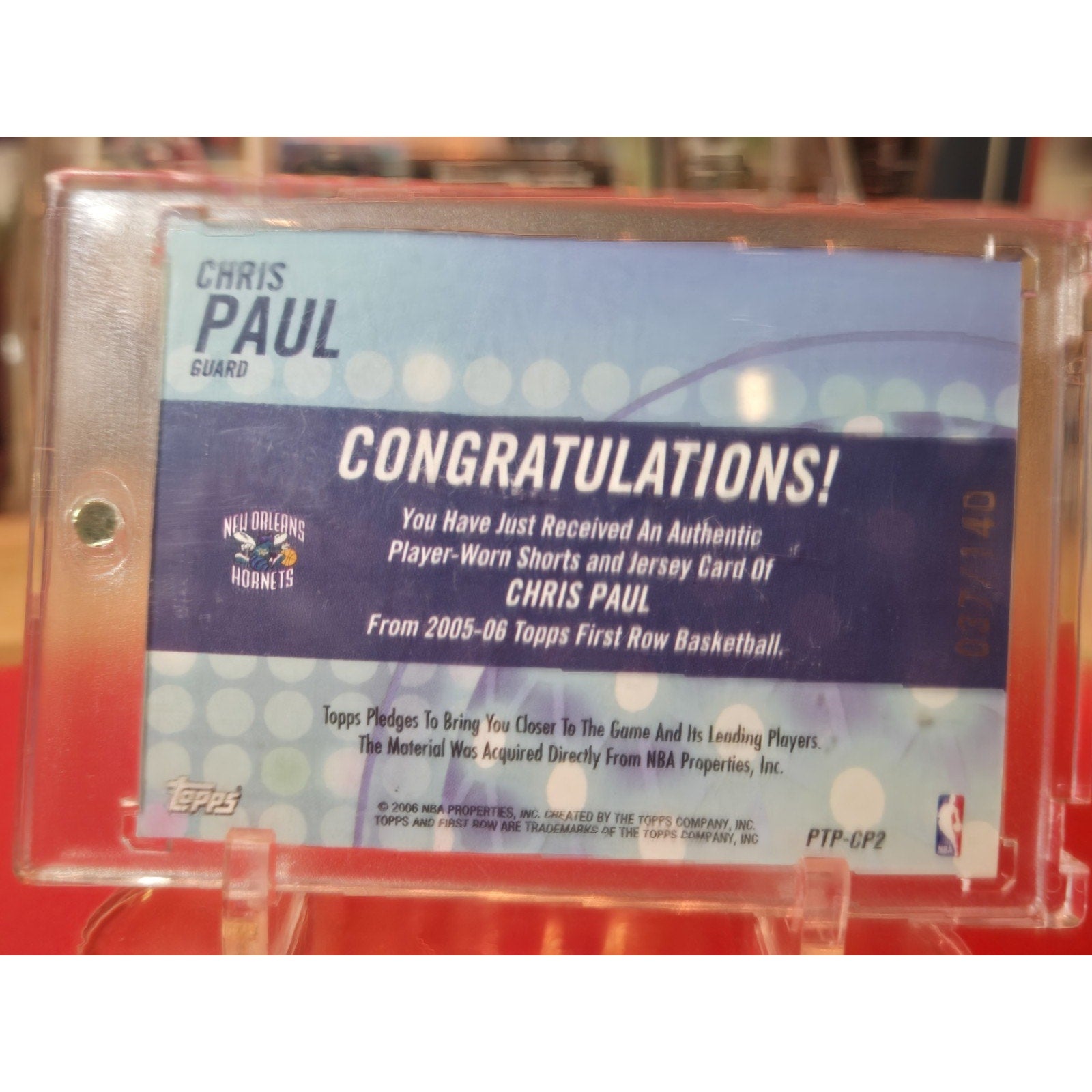 The product is a 2005-06 Topps First Row trading card featuring Chris Paul of the New Orleans Hornets. This particular card is part of the Ptp Dual Relics insert set, with a print run of 140. The card includes a piece of memorabilia and is serial numbered, making it a valuable addition to any basketball card collection. It is a base variety card with no autograph, perfect for fans of Chris Paul or collectors of NBA memorabilia.