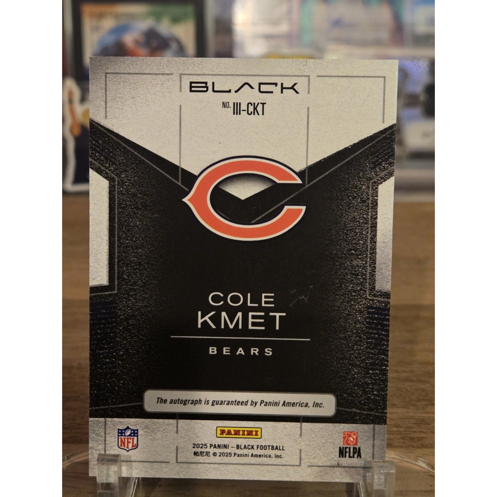 The product is a 2025 Panini Black Football trading card featuring an autograph from Cole Kmet, signed on a label or sticker. This limited edition card has a print run of only 99 and is part of the Instant Impact Ink series. The card is made of 20 Pt. card stock and is an original, licensed reprint by Panini. It is a valuable collectible for fans of the National Football League, specifically the Chicago Bears, and collectors of sports trading cards.