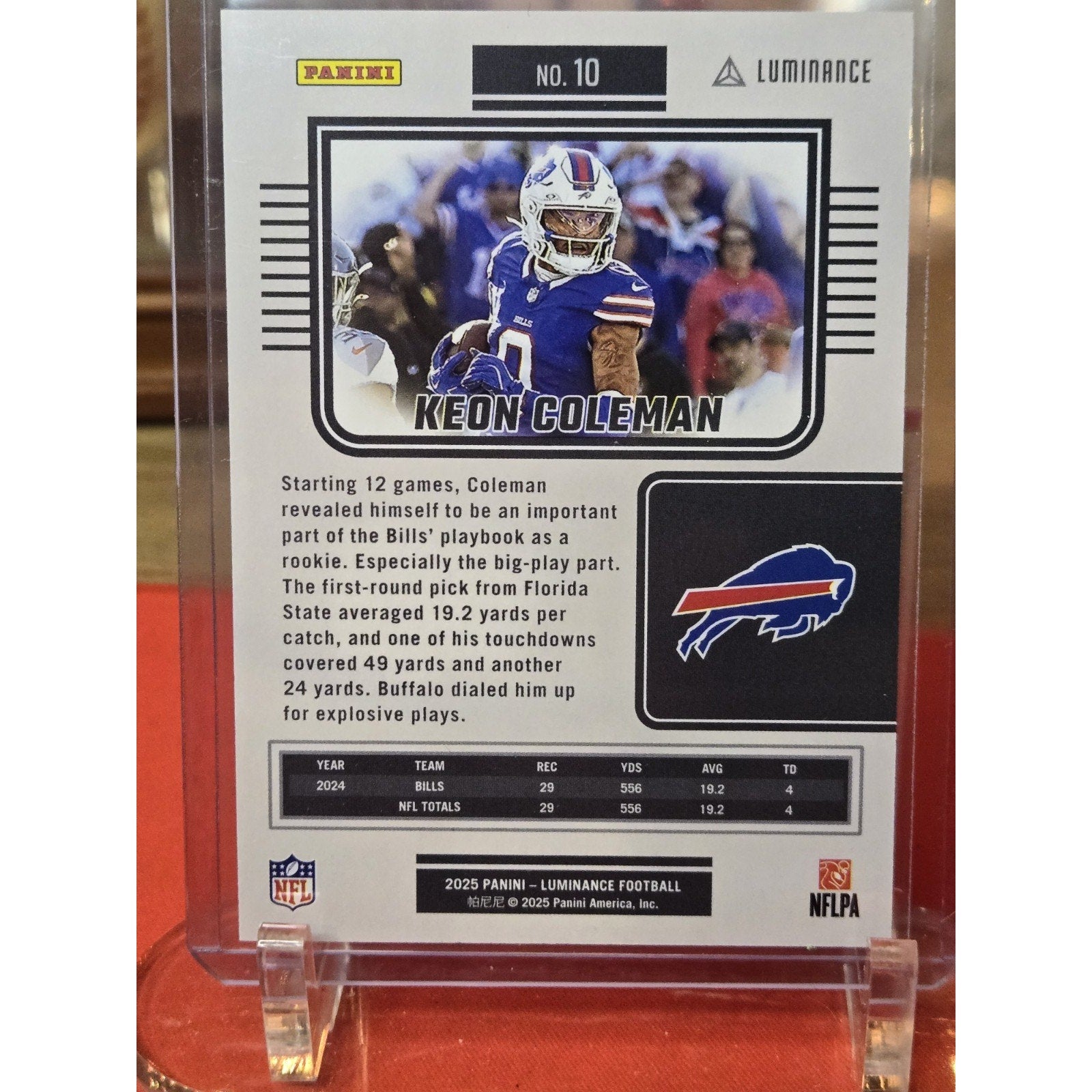 The Keon Coleman 2025 Luminance Aqua Parallel trading card is a limited edition collectible featuring the player from the Buffalo Bills in the National Football League. Manufactured by Panini, this sports trading card is part of the 2025 Luminance set and comes in a rare Aqua parallel variety, making it a coveted piece for fans and collectors alike. With only 35 copies in existence, this card showcases Keon Coleman in a unique and sought-after design for football enthusiasts.