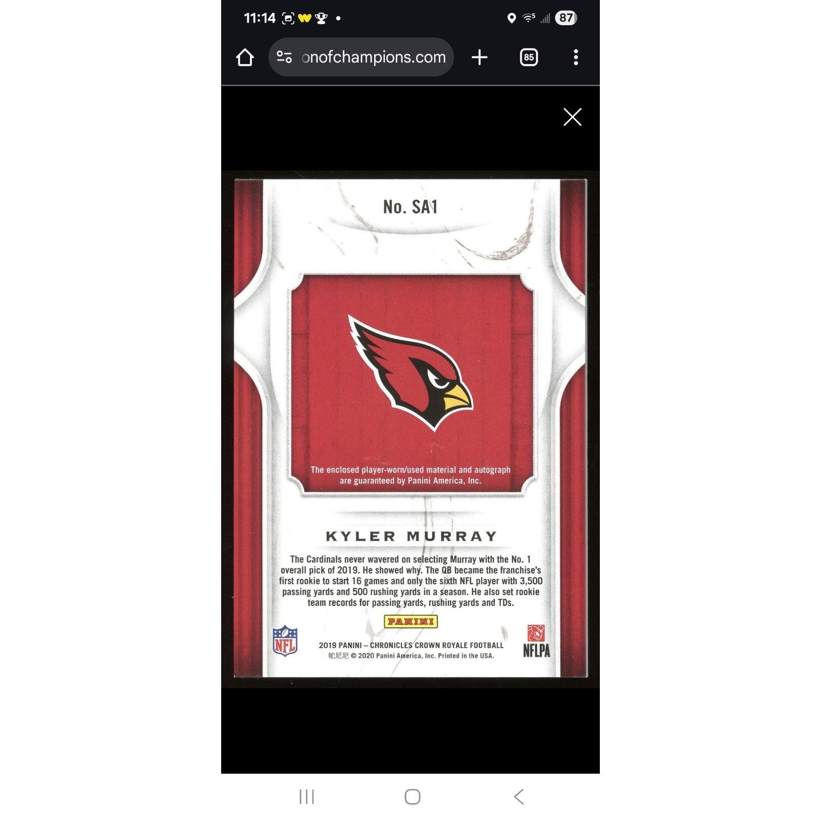 The product is a 2019 Panini Crown Royale Silhouette Autographs trading card featuring Kyler Murray of the Arizona Cardinals. This autographed card is numbered /49, making it a rare rookie card. It is part of the Panini Chronicles set and includes a piece of memorabilia from the player. A highly sought-after collectible for fans of the National Football League, this card showcases Murray's signature and is a valuable addition to any sports trading card collection.