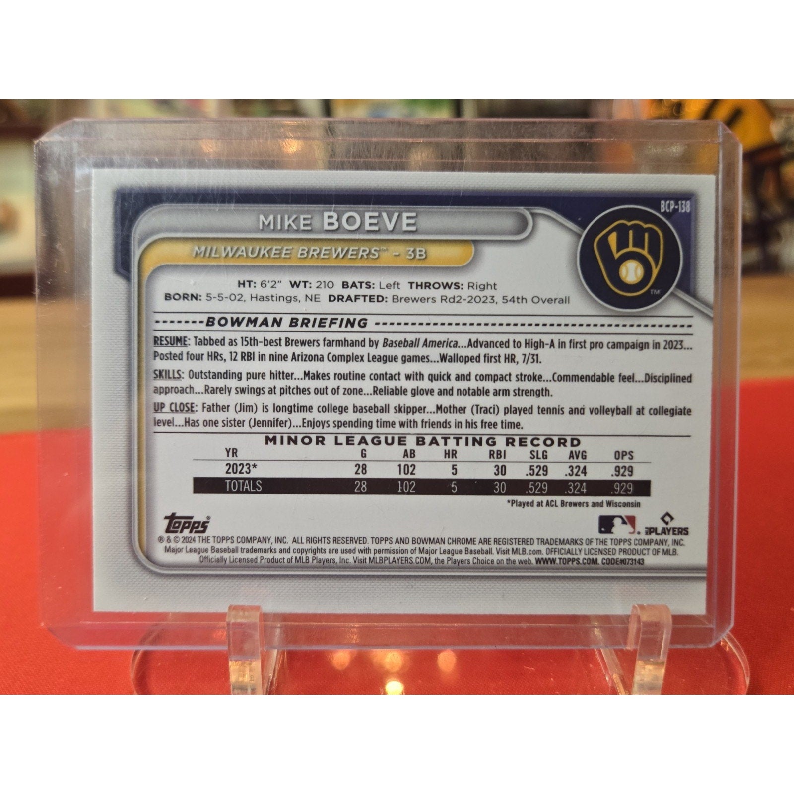 The product is a highly sought-after 2024 Bowman Sapphire Edition trading card featuring Major League Baseball player Mike Boeve from the Milwaukee Brewers. This limited edition card is numbered out of 50 and is part of the Chrome Prospects insert set by Topps. The card is categorized as a Gold parallel variety, adding to its rarity and value among collectors. As a serial numbered rookie card, it represents a unique and special addition to any baseball card collection.