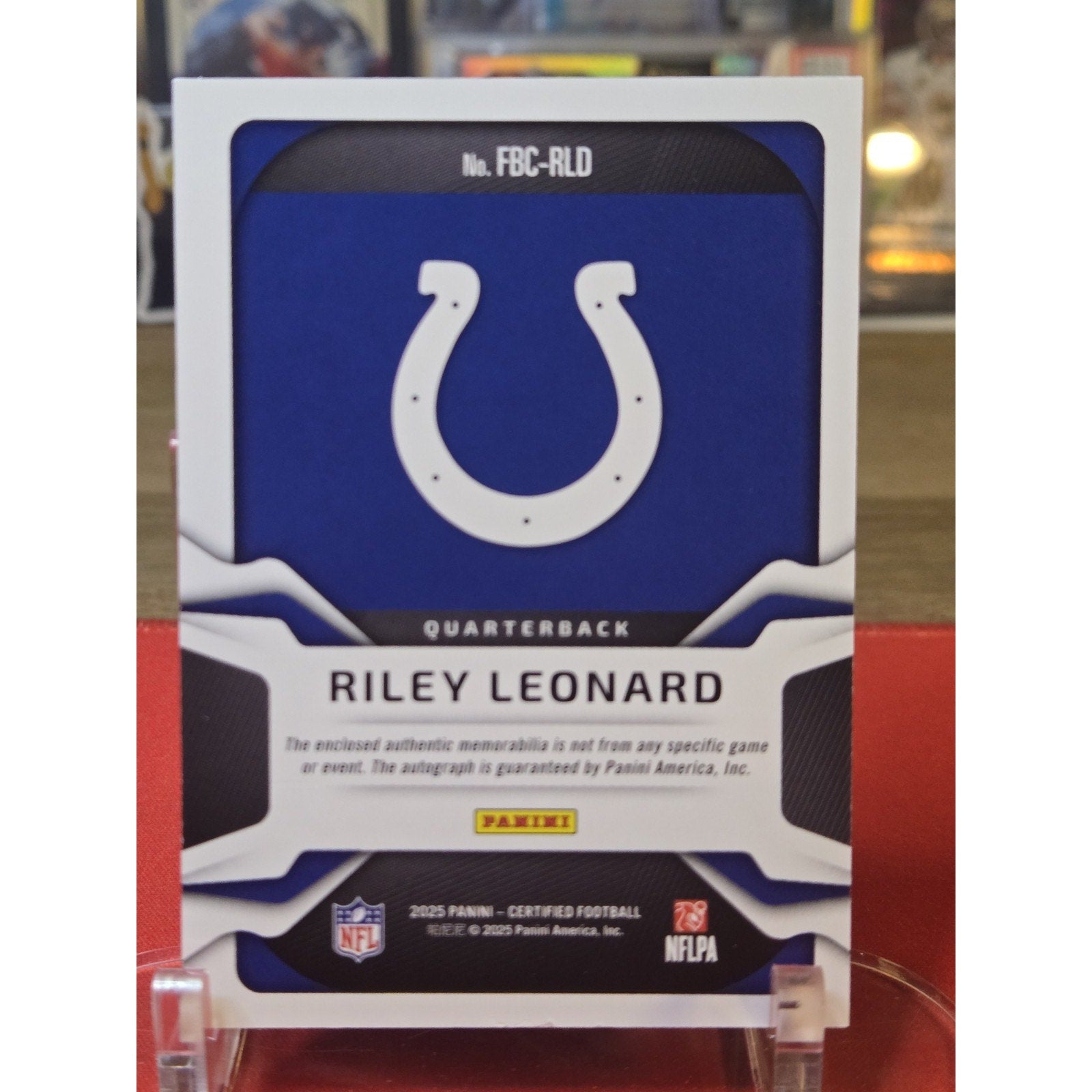 The product is a 2025 Panini Certified Freshman Fabric Rookie Patch Auto trading card featuring National Football League (NFL) player Riley Leonard from the Indianapolis Colts. This limited edition card has a print run of 25 and is autographed by the player, making it a highly sought-after collectible for football fans and trading card enthusiasts. The card is part of the 2025 Panini Certified set and showcases a patch of the player's jersey, adding to its value and appeal.