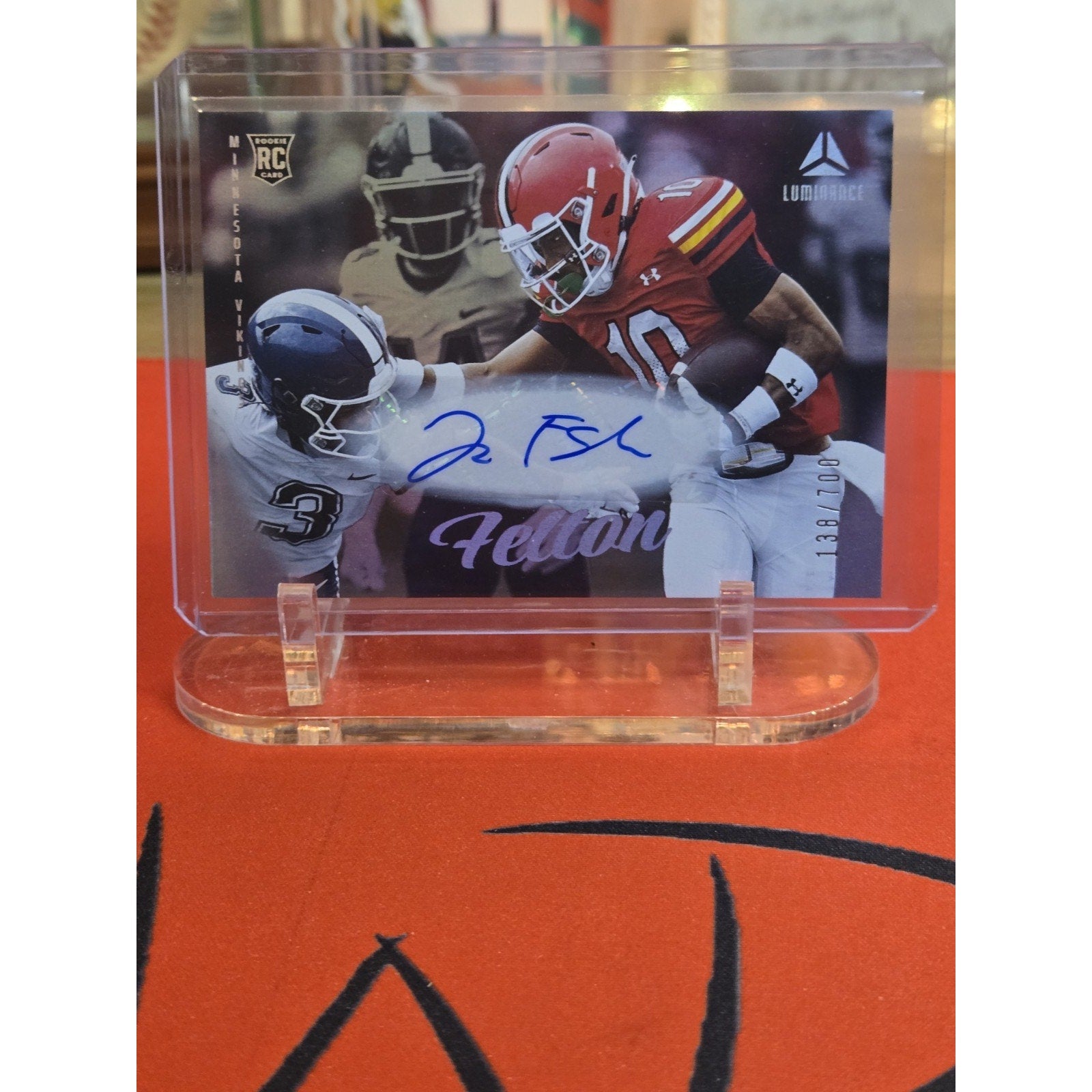 The product is a 2025 Panini Luminance trading card featuring Tai Felton, a rookie player for the Minnesota Vikings in the National Football League (NFL). This autographed card is part of a parallel/variety set with a limited print run of 700. It is a highly collectible item for fans of football trading cards, especially those interested in rookie players and serial numbering. The card is a valuable addition to any sports memorabilia collection, especially for fans of the NFL and the Minnesota Vikings.