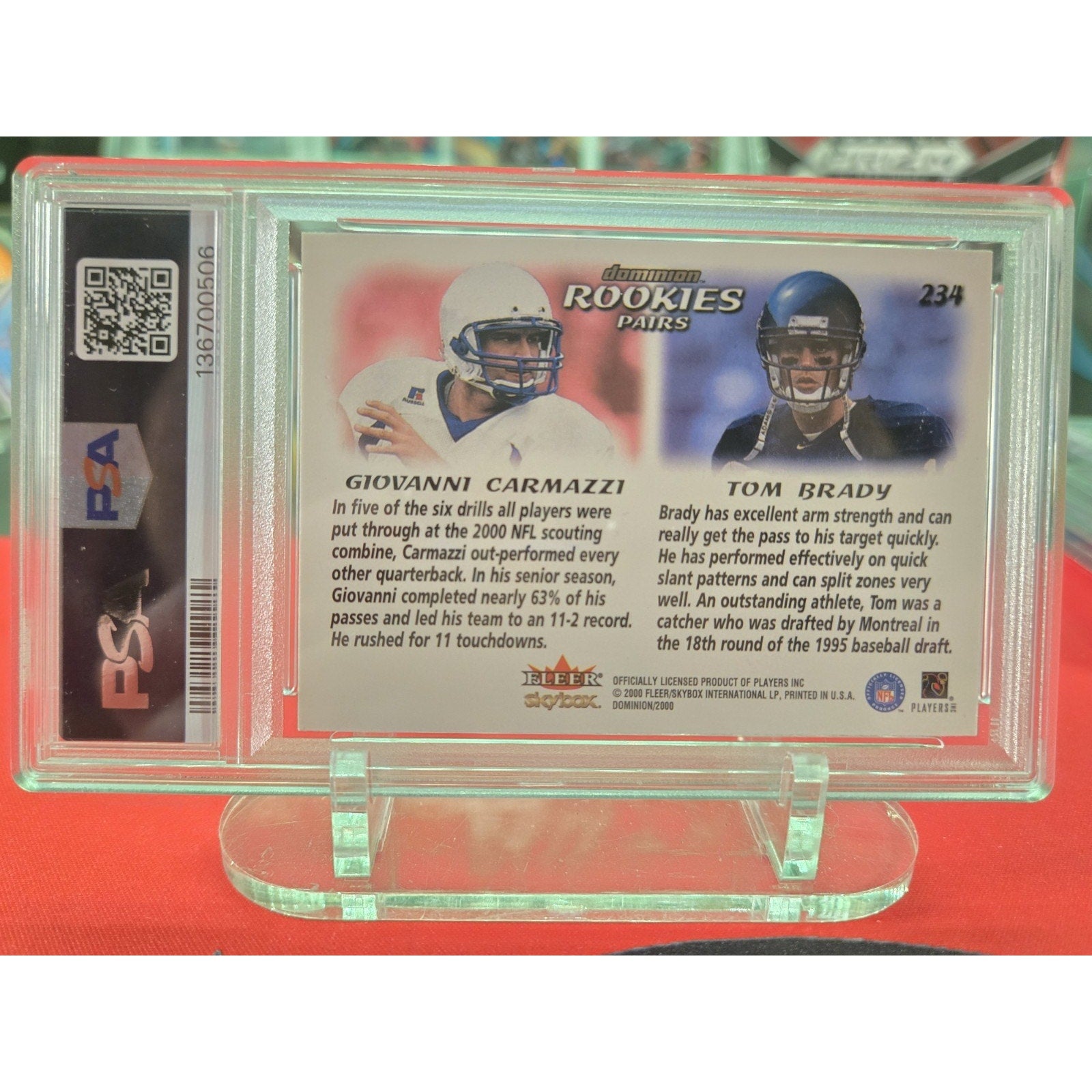 The product is a 2000 Skybox Dominion trading card featuring football players Tom Brady and Giovanni Carmazzi. This Rookie card from the set is part of the Base variety and is numbered #234. Manufactured by Fleer/SkyBox International, the card showcases Brady, who would go on to become a legendary player with the New England Patriots, and Carmazzi, who played for the San Francisco 49ers. This collectible item is a must-have for fans and collectors of NFL trading cards, especially those interested in rookie cards from the early 2000s.